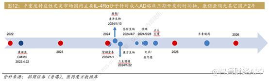 此外,国内还有康乃德/先声乐德奇拜单抗(CBP-201),智翔金泰,麦济、恒瑞医药(SHR-1819),三生国健(SSGJ-611)和康方(AK120)等多家公司针对IL-4Rα靶点在AD等领域进行开发,但无论是开发进度,还是临床效果,目前来看对比CM310均处于劣势。乐德奇拜单抗(CBP-201)刚刚提交上市申请,其它IL-4Rα类单抗仍处于临床三期。